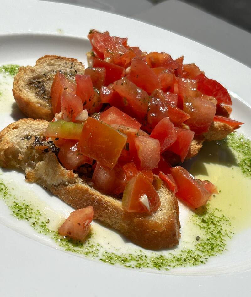 Als we aankomen hebben we niet gereserveerd. Gelukkig is er nog plek voor twee, wel in de zon. Maar een lekkere lunch laten we ons niet door de neus boren.