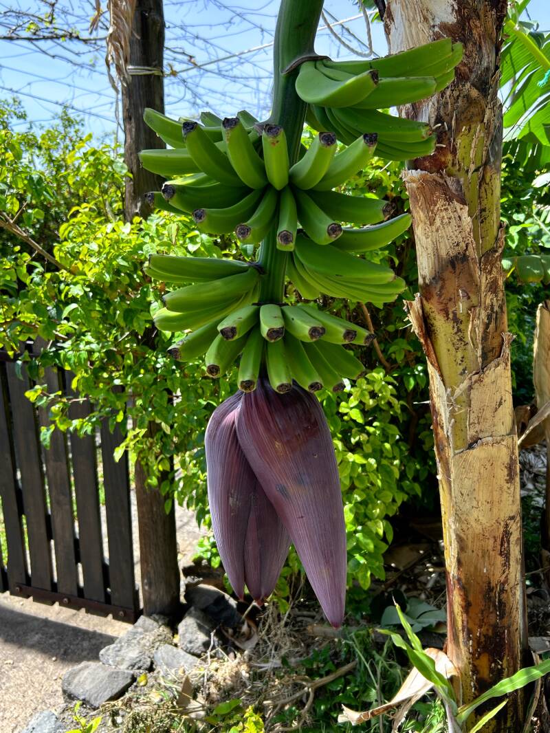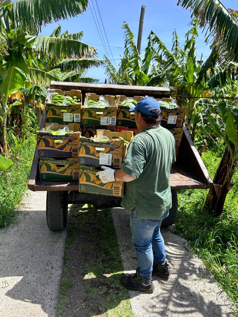 Beneden wandel je door de bananenplantage naar het restaurant. De medewerkers zijn de bananen aan het oogsten.