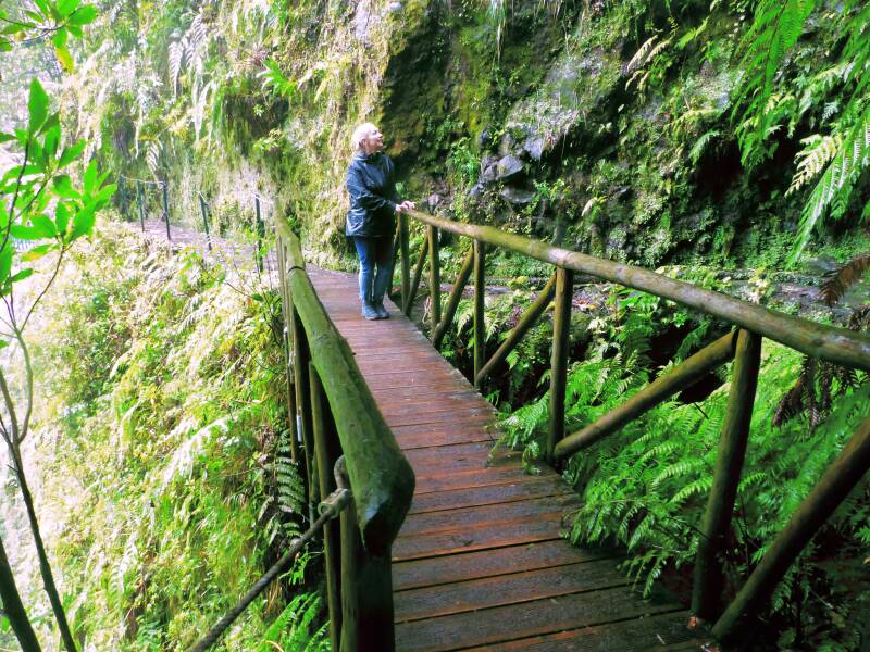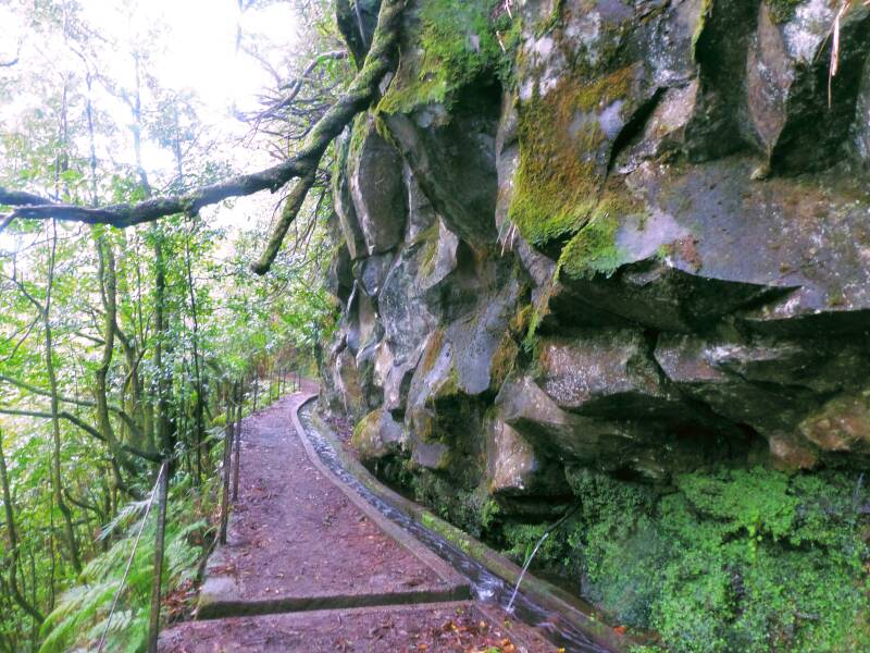 We hebben de Levada dos Cedros (PR14) gewandeld. Deze route volgt de Levada dos Cedros, een van de oudste Levada's in de regio. Gebouwd in de 17e eeuw. Langs het wandelpad, dat ons meeneemt naar het inheemse Laurissilva-bos, komen wij langs majestueuze bomen tegen die 30 tot 40 meter hoog zijn. We wandelen voorbij de steile helling van de rechteroever van de Ribeira da Janela-beek. Daar zien we weinig van, omdat het zo mistig is.