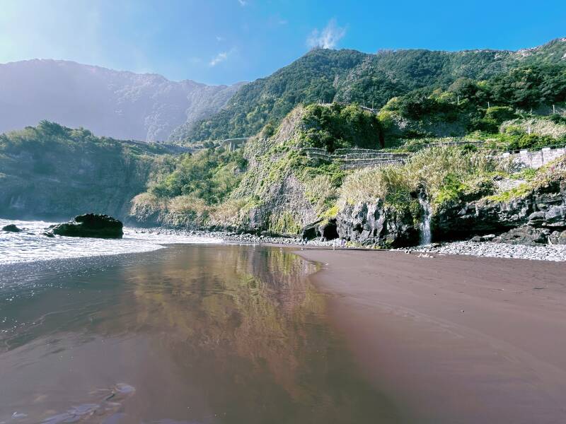 Om hier te komen moet je via een trap in door de vulkanische kliffen naar het strand afdalen. Het is niet gemakkelijk om op het strand te lopen. De rotsen zijn groot. De golven zijn betoverend.