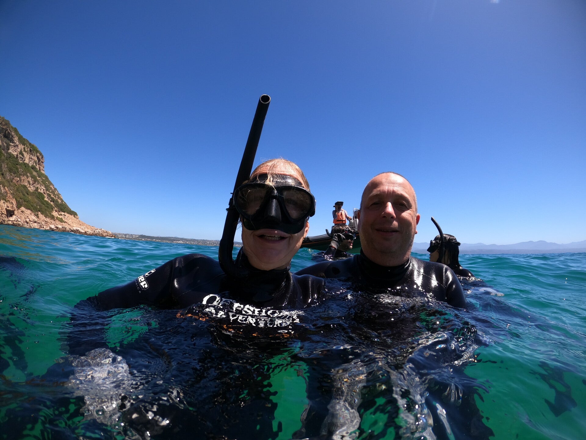 Maar eerst in het wetsuite gehezen worden. Flippers passen. Op de boot, door een traktor het water in getrokken worden en over de golven richting Robberg Nature Reserve. Dit allemaal was al een avontuur.