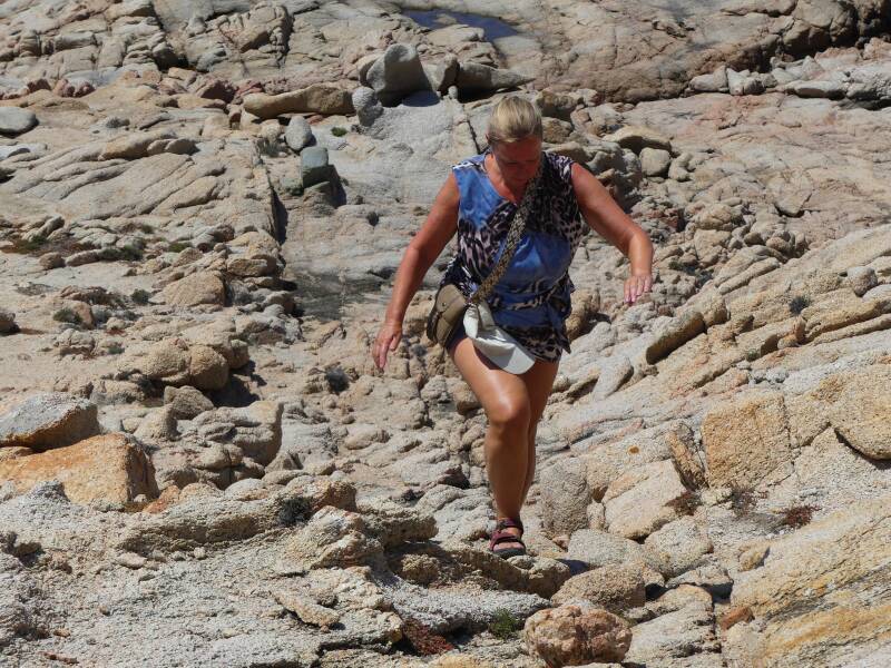 Het terrein bij Punta Abbatoggia is moeilijk toegankelijk. Het is allemaal rots. De paden zijn gemarkeerd. Het is zoeken en zoeken, en dat allemaal in of onder een brandende zon. De granieten stenen in de brandende zon doen pijn aan de ogen. Bij het verlaten van Punta Abbatoggia komen we langs Spiaggia dello Strangolato. We nemen er onze eerste frisse duik van de dag. Heerlijk: Het zweet staat op de rug van de wandeling, het zeewater verfrist heerlijk. De vissen zwemmen langs heen en zijn niet bang. Het zijn geen kleine vissen. We laten ons opdragen en wandelen weer verder.