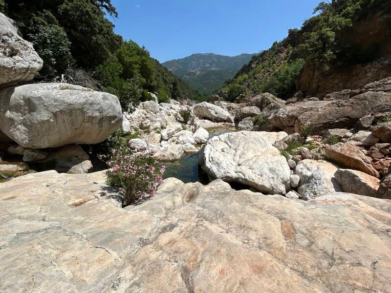 Rechts van het pad bevindt zich het imponerende Supramonte-bergmassief. Links openbaart zich, behalve de rivier, de vallei met aan het einde de kloof. Waterbekkens met glashelder water en warme grote keien nodigen, net als de al aanwezige zonaanbidders, uit om een verfrissende duik te nemen. Op enkele plekken met een lage waterstand kun je lekker verkoelen. Het is een redelijk zwaar parcours, dat regelmatig omhoog en omlaag gaat. Na ruim twee uur worden de rotswanden beduidend smaller en bereiken je eindelijk de ingang van de tot het laatst toe verborgen gebleven kloof, de Su Gorropu. De rivier stroomt hier ondergronds in het ravijn en de ondergrondse bekkens van het Supramonte-massief. Het waterpeil stijgt alleen na hevige regenval, waarna het weer langzaam wegzakt onder de grond.