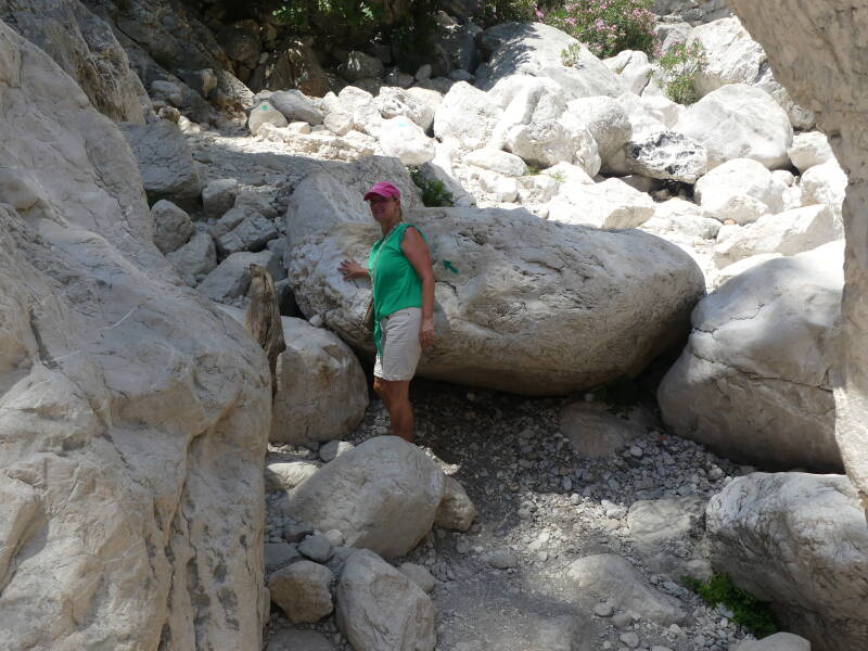 Maar de groene route is inmens. De grote witte keien versperren de ingang alsof ze bezoekers tegen willen houden. Het eerste stuk van honderd meter is het groene, zichtbaar gemarkeerde gedeelte, dat eigenlijk voor de meeste mensen (mits je goede schoenen aanhebt) te doen is. Her en der word je omhoog ‘geholpen’ door een stuk touw of door een extra neergelegde kei of boomstam die neergelegd zijn om het ongerepte karakter te behouden. Maar het is evengoed al flink klauteren over de gigantisch grote witte keien, sommige zijn wel vijf tot zes meter in doorsnede! Het groen gemarkeerde gedeelte eindigt bij het smalste stuk van de kloof, die op die plaats slechts vier meter breed is.