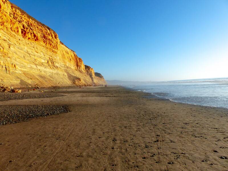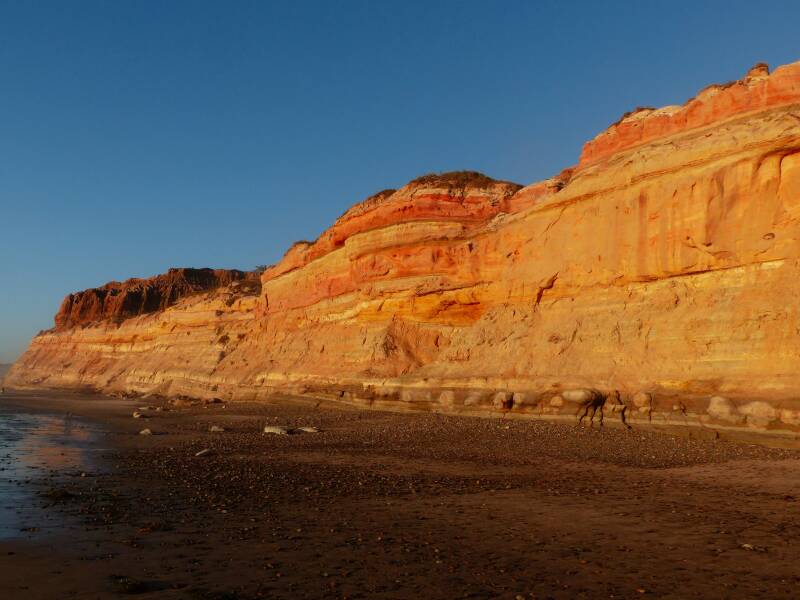 Het is een grillige gevormde kust met ruige kliffen. Wij komen hier aan het eind van de middag aan. Een moment waarop je denkt dat de mensen het strand verlaten. Niets is minder waar, er komen nog tal van mensen aan om te genieten van het strand.