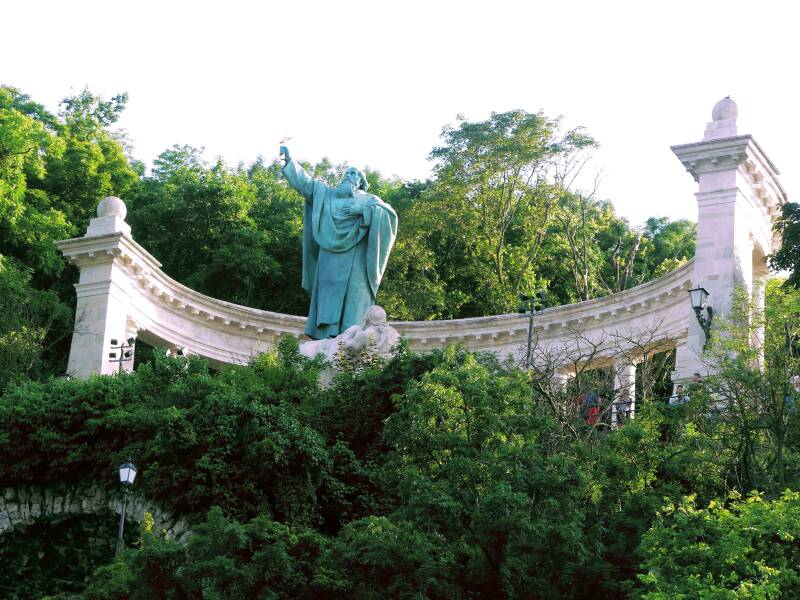 Dan door naar het Gellértmonument. Het Gellértmonument is gebouwd bij zo’n bron. Volgens de legende is bisschopo Gellért hier in de 11e eeuw van een rots gegooid door de oorspronkelijke bewoners van Hongarije. Het beed toont Gellért met aan zijn voeten een van de Magyaren die wel christen was geworden.