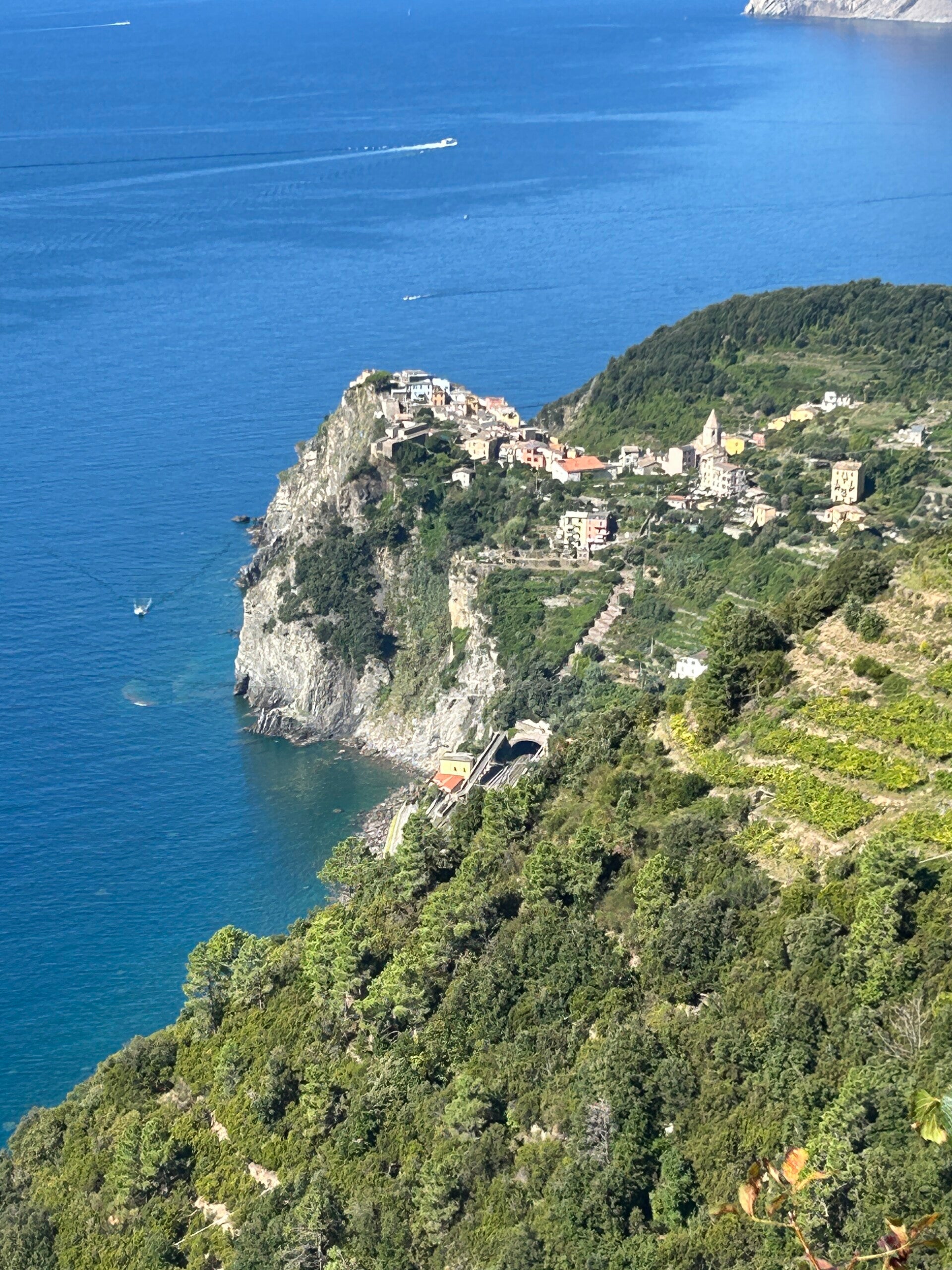 Dit alternatieve pad is moeilijker, de tocht begint vrij pittig. We klimmen snel omhoog en daarmee krijgen we zicht op Corniglia en kunnen dan daadwerkelijk zien hoe mooi dit dorp op een rots ligt. Gelukkig wandelen we dit gedeelte door een prachtig bos. Gelukkig, omdat we zo beschermd zijn tegen de brandende zon. Het bos is prachtig omdat we ontzettend veel verschillende soorten planten en bloemen tegen komen.