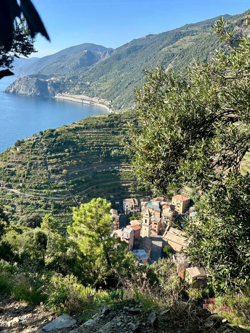 We verlaten Manarola, we moeten klimmen en krijgen dit prachtige beeld van Manarola en de kustlijn gepresenteerd