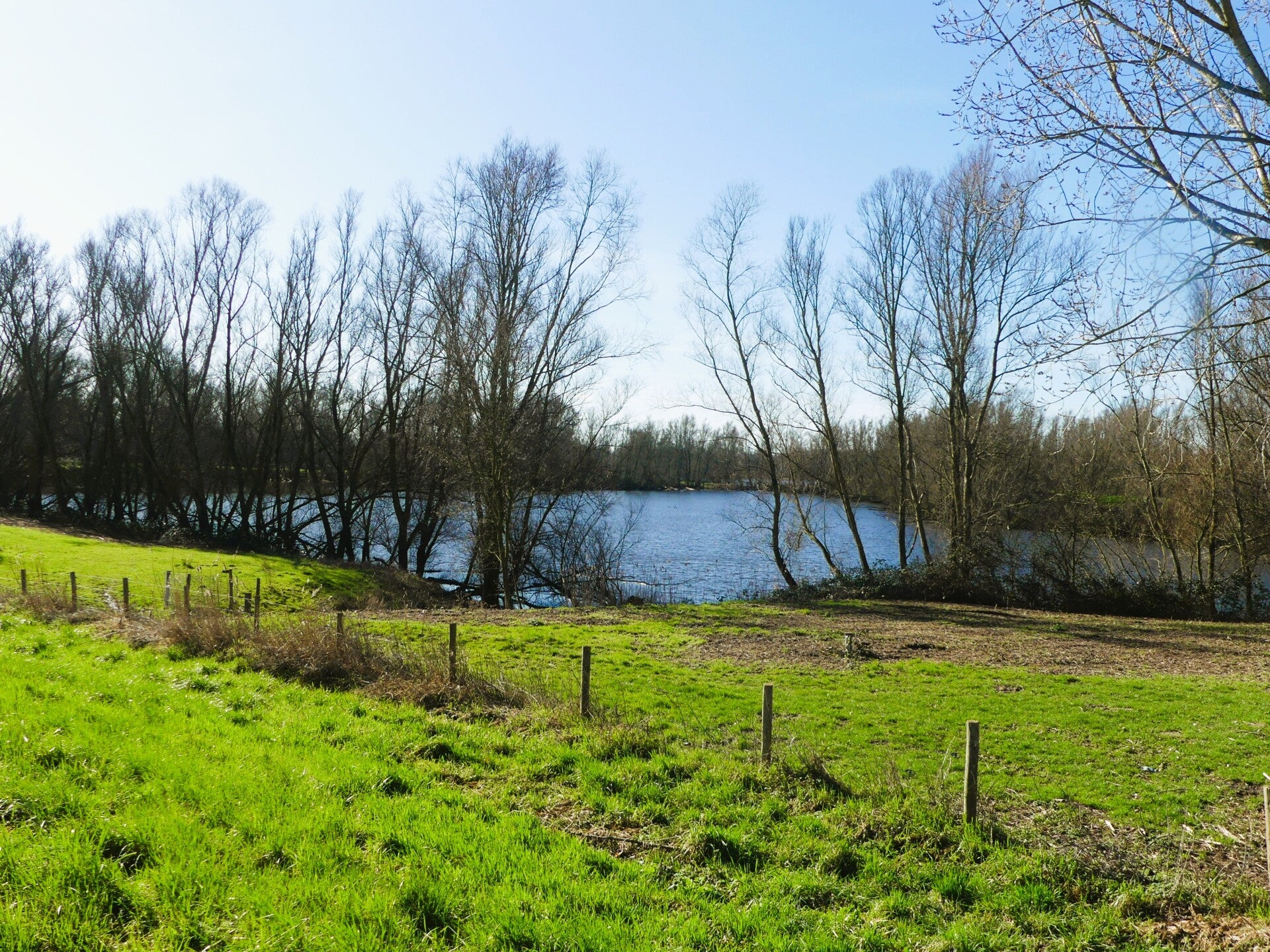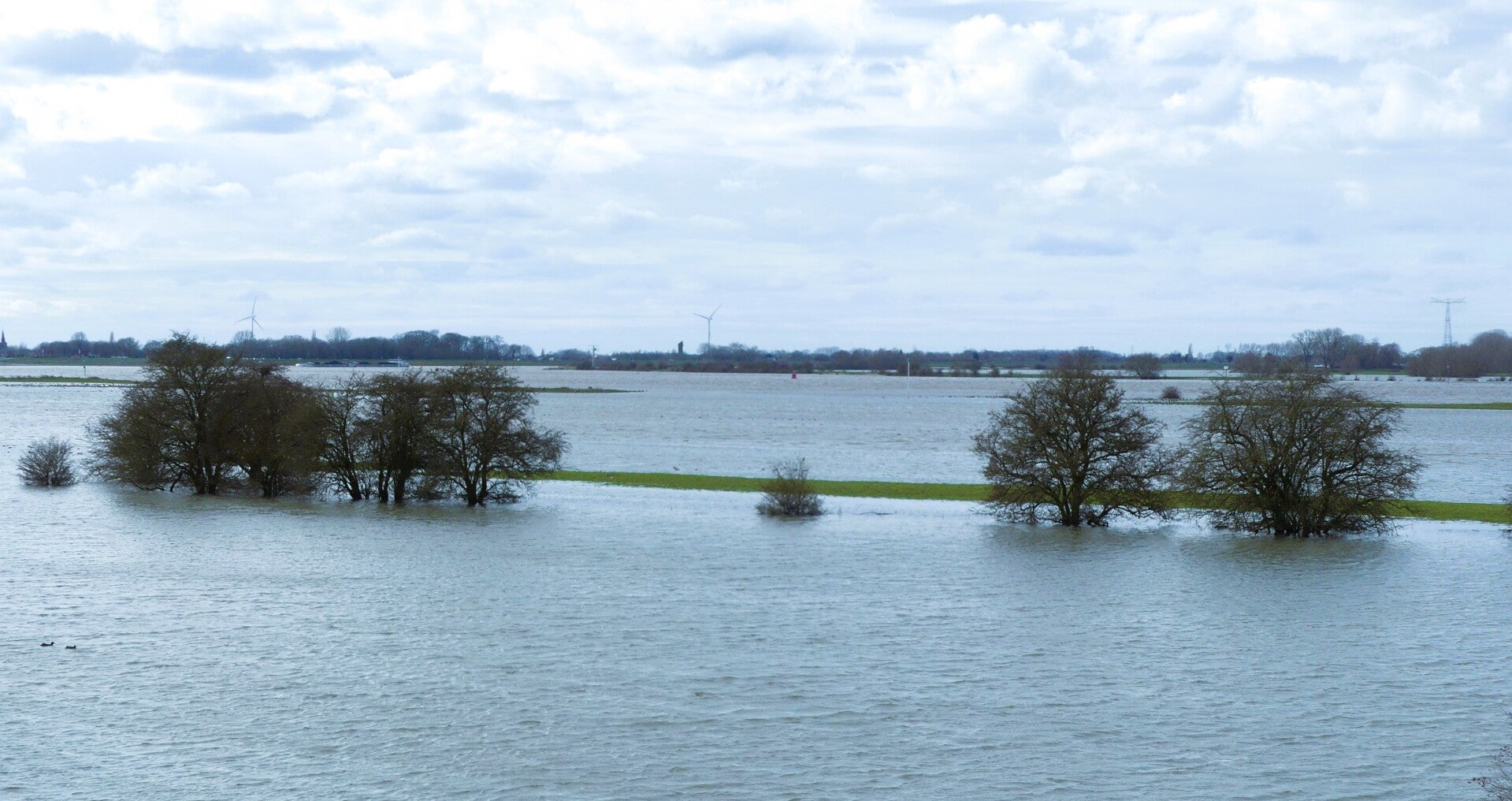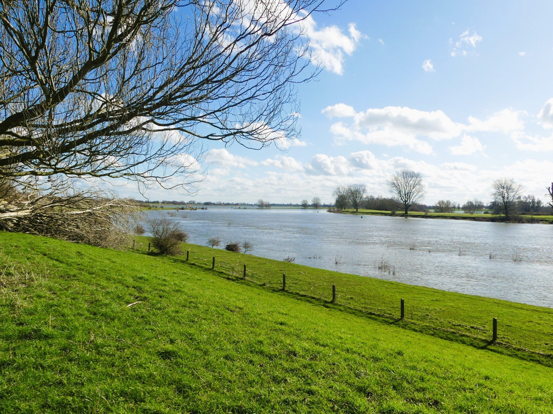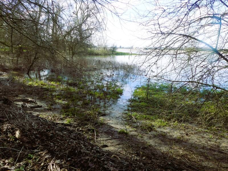 De zon staat laag maar warm, het water glinstert, en het is bijna surrealistisch hoe snel de landschappen hier wisselen. Binnen twee kilometer staan we al aan de Waal, terwijl we net nog langs de Maas liepen. Het is alsof je door een miniatuurversie van Nederland wandelt: twee grote rivieren, een kanaal, dijken, oude rivierarmen, de lage uiterwaarden, de subtiele verhogingen in het terrein — alles binnen handbereik. En op 1 maart staat het water hoog. De uiterwaarden staan vol met water. Mooi gezicht hoor!