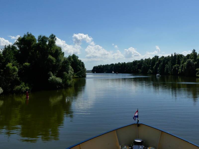Het Rijnwater heeft hier bij deze uitmonding het eindpunt bereikt. Wij varen rechts het kattediep in.