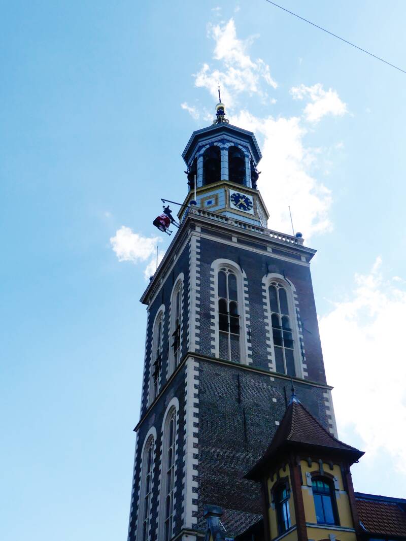 Van afstand zien we de Kamper Koe al hangen. Wat zo leuk is, toen we hier in onze tienerjaren waren, hing de koe er ook. Memories! Wat is het verhaal achter deze Kamper Koe? Er groeide eens gras op de Nieuwe kerktoren in Kampen. Men wilde dat gras verwijderen, en hees daarom een koe in de toren, met een touw. Echter, halverwege legde het beest al het loodje. Zijn tong bungelde uit de mond van het dode dier, waarop de Kampenaren riepen: "kijk, hij is al bijna bij het gras en heeft er al zin in, want zijn tong hangt al uit zijn mond bij het zien van al dat lekkers!"
