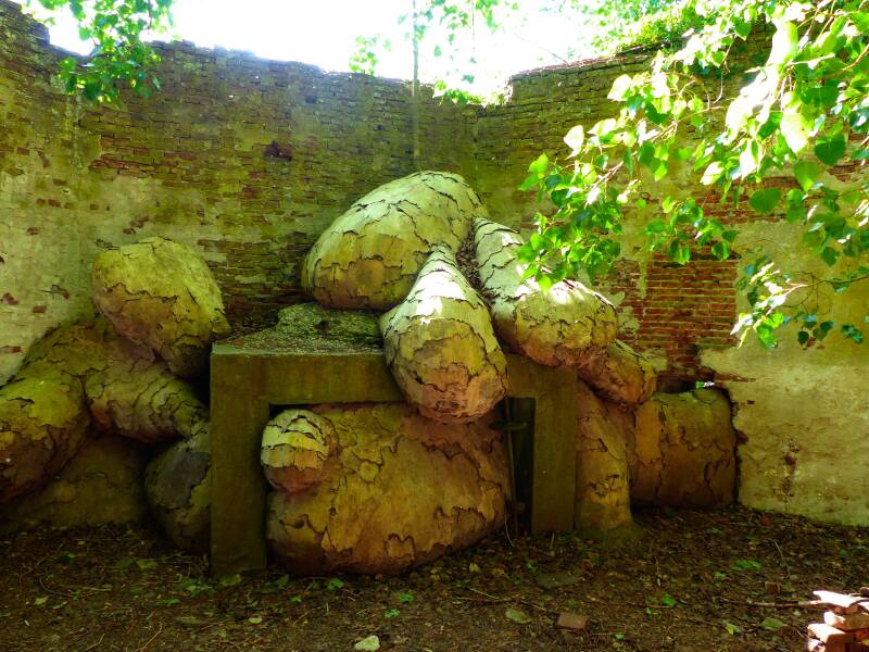 Via het Voorster Beek komen we op het pad De Halmen. Direct komen we langs Ruïne Oude Korenmolen. In deze Ruïne is een kuntwerk gebouwd: Het Woekerende kunstwerk.
