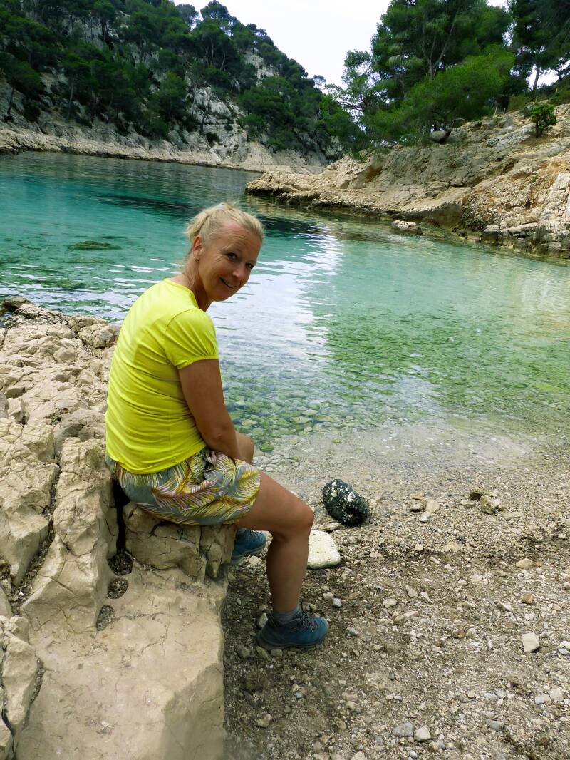 Na wat geklim en dalingen via heuvels en gladde stenen in de oude steengroeveve van Port-Miou , komen we aan bij Calanque Port-Pin. We zijn vroeg, er zijn weinig mensen. Port-Pin.....het strandje is het eerste wat we zien....het lijkt wel een idyllische omgeving, een oase van rust (maar we zijn nog vroeg). Kristalhelder water dat het blauw van de lucht en het groen van het bos weerkaatst, oogverblindende witte rotsen , overschaduwd door dennen. Wij rusten op het kiezelstrand meteen prachtig uitzicht over de azuurblauwe zee.