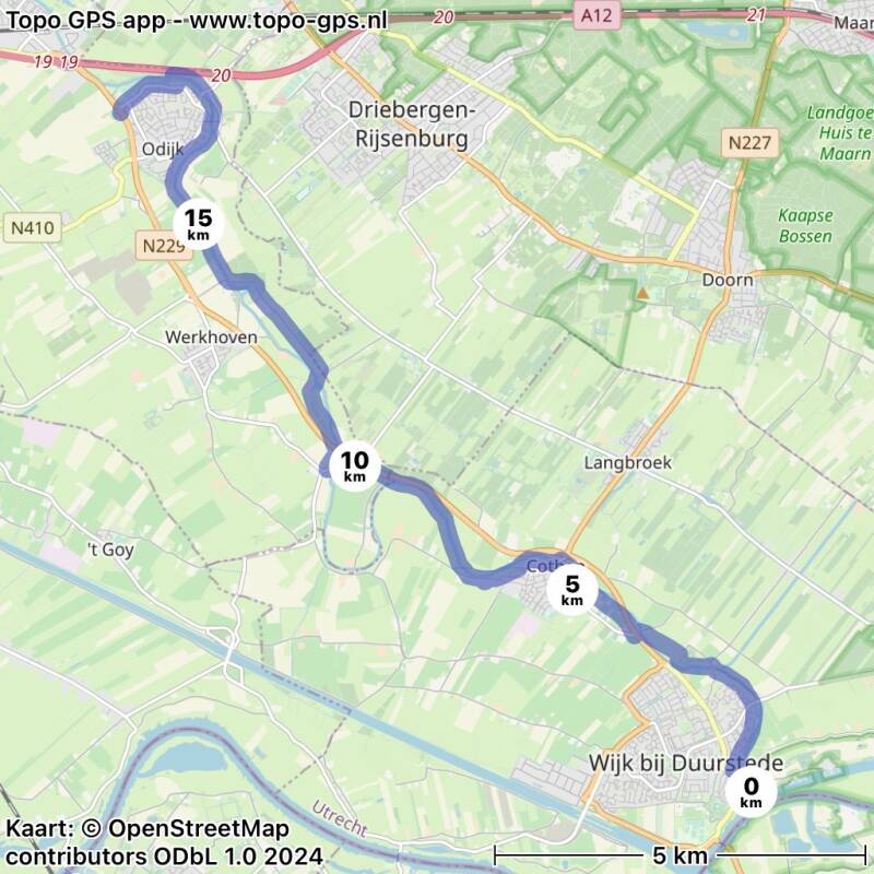 De rivier stroomt langs de bebouwde kom van Wijk bij Duurstede. Bij de Groenewoudseweg verlaat de rivier de bebouwde kom. De Kromme Rijn is dan onderweg naar Cothen. De omgeving is groen, groener en het groenst. Het water staat hoog in de rivier en is op sommige plekken buiten de oevers getreden. Maar het wandelpad heeft er geen last van. Kersen, appels en peren: de Kromme Rijnstreek heeft het allemaal. De boomgaarden in de Kromme Rijnstreek zijn te danken aan de Romeinen. Tweeduizend jaar geleden plantten ze hun fruitbomen op de vruchtbare gronden langs de rivier. Dat bleek een succes; ze waren de eersten in de regio die op grote schaal fruit verkochten.
