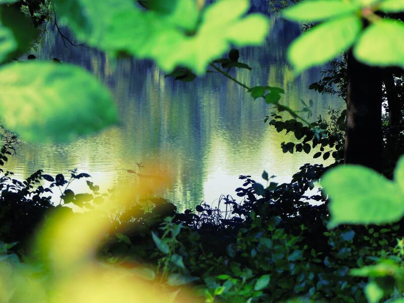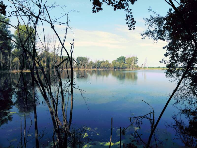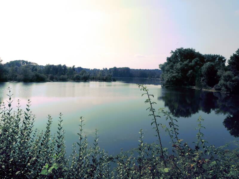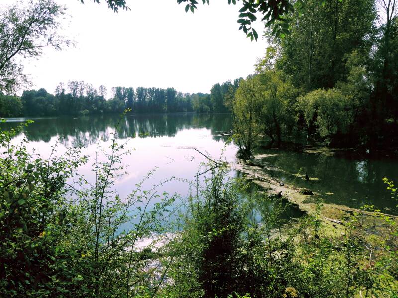 In dit gebied zijn verschillende steengroevemeren. Helaas kunnen we niet bij deze meren komen. Bomen, struiken en fysieke poorten belemmeren ons de toegang tot het water. Mensen die in de buurt wonen, hebben blijkbaar privé strandjes aan deze meren. Aan het eind van het meer, zien we een mogelijkheid om richting het water te gaan. Het prikkeldraad langs ons wandelpad is deels vernietigd, met een klein beetje moeite kunnen we er probleemloos overheen. We krijgen zo gelukkig toch nog een mooie blik op deze meren.
