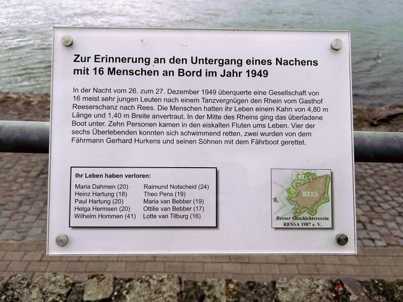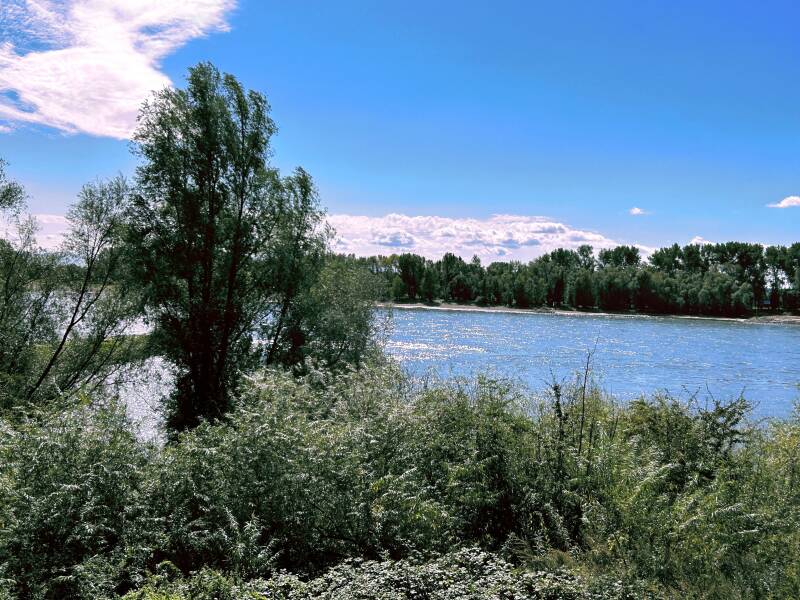 Op 8 september schijnt de zon. Het is dan heerlijk vertoeven aan de Rijnpromenade. Bij Rheincafé Rösen is het heerlijk zitten in de zon, met een uitkijk op de Rijn. De nodige mensen wandelen over de Rijnkade. We hebben prachtig zicht op de Flutmulde Rees, die we op 1 september bezocht hebben. De boten varen stroomopwaarts en stroomafwaarts. Het is geen gezellige drukte aan de Rijnkade.