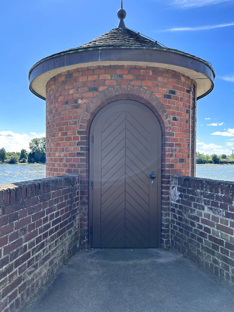 We paseren de Molentoren. Naast zijn molenfunctie diende de toren ook als bolwerk tegen de druk van de ijskoude Rijn. Uitgerust met kleine muurkanonnen diende het ook om de stad te verdedigen tegen vijandelijke aanvallen.