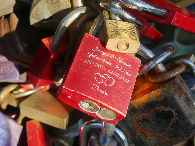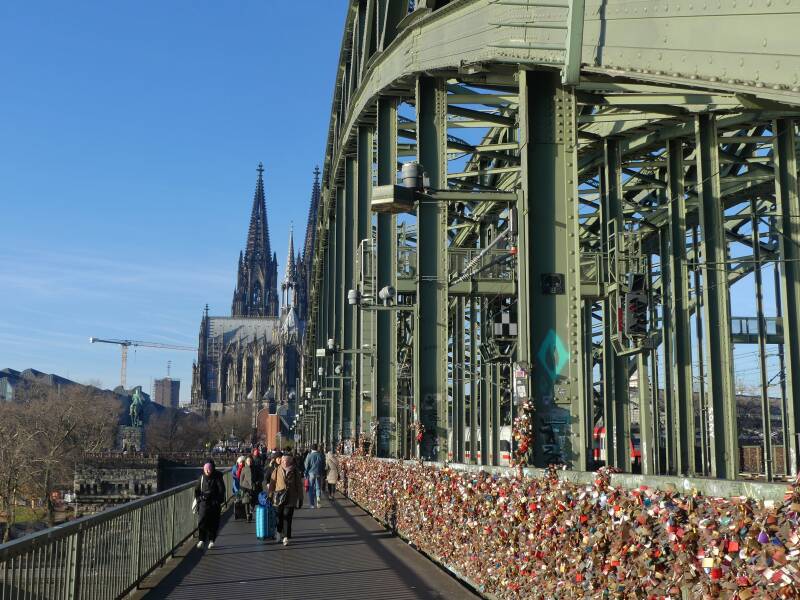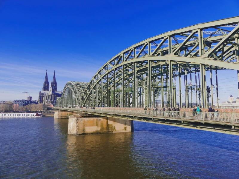 De Hohenzollernbrücke is een van de meest herkenbare objecten van Keulen. Het is een drievoudige boogbrug van de dom naar de KölnTriangel. Al sinds het begin van de 20ste eeuw ligt deze belangrijke spoorbrug in Keulen over de Rijn. De Hohenzollernbrücke is heel herkenbaar door zijn drie bogen. De brug biedt ruimte voor treinen, trams, auto’s, fietsers en voetgangers. Tijdens een wandeling over de brug zie je veel sloten van verschillende formaten die bevestigd zijn aan de wanden van de brug.