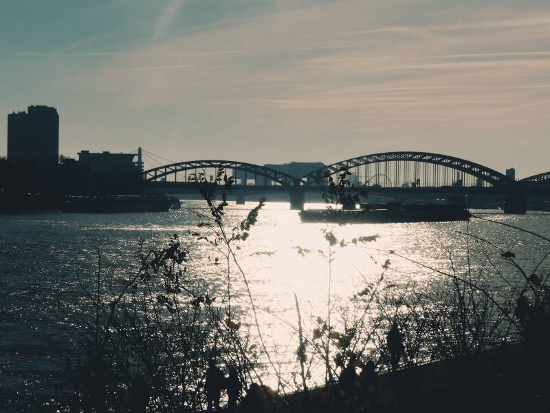 Eenmaal aan de overkant van de Rijn kun je wandelen over de Rijnboulevard met zicht op de Rijn en de diverse bruggen de Kuelen verbinden. Wij wandelen door Rheinpark. Een van de bijzondere kenmerken van het park is de centrale ligging direct aan de rechteroever van de Rijn. Daar komt bij een mooi zicht op de skyline van de stad op de linkeroever van de Rijn met de kathedraal als herkenningspunt.