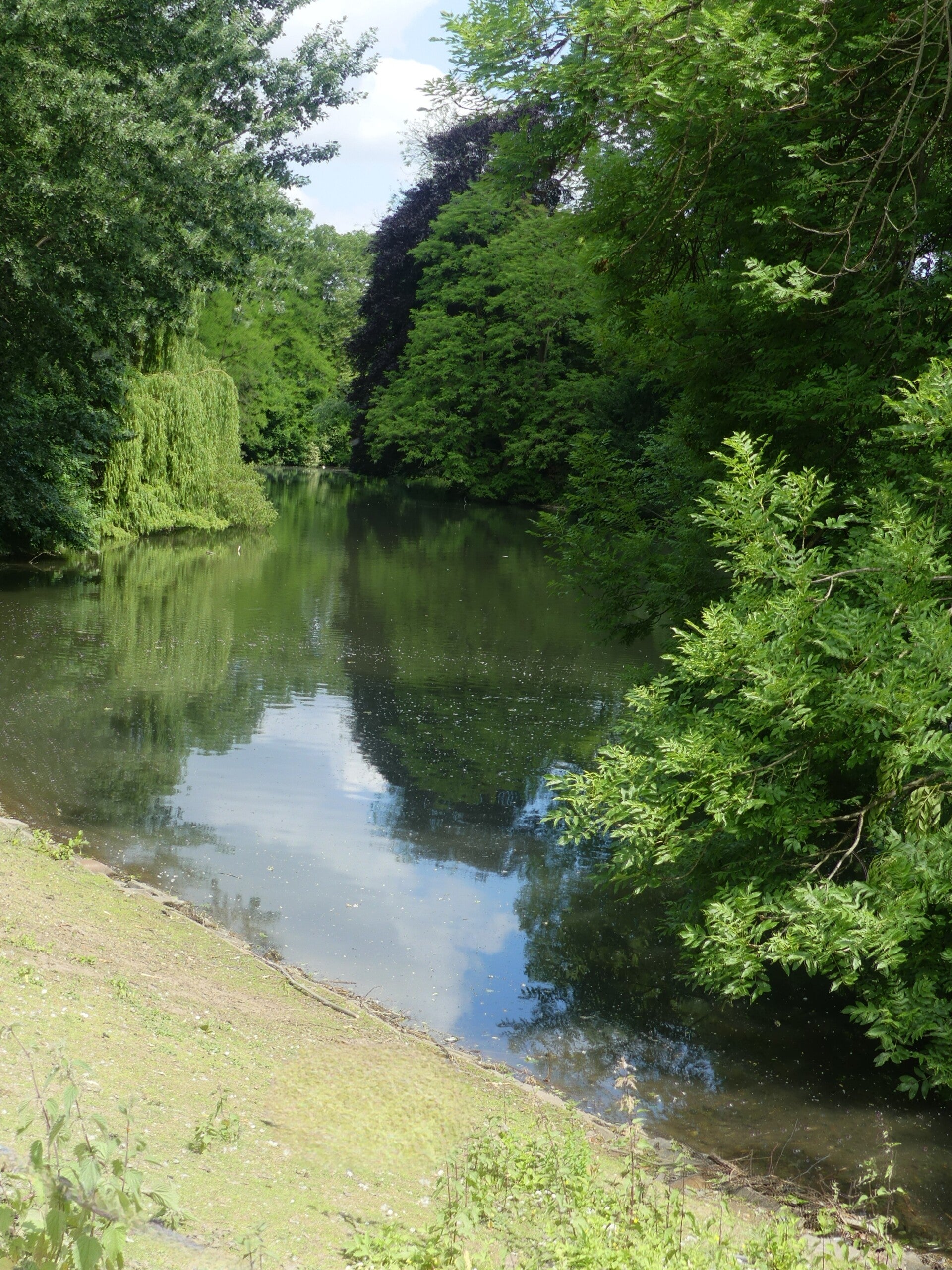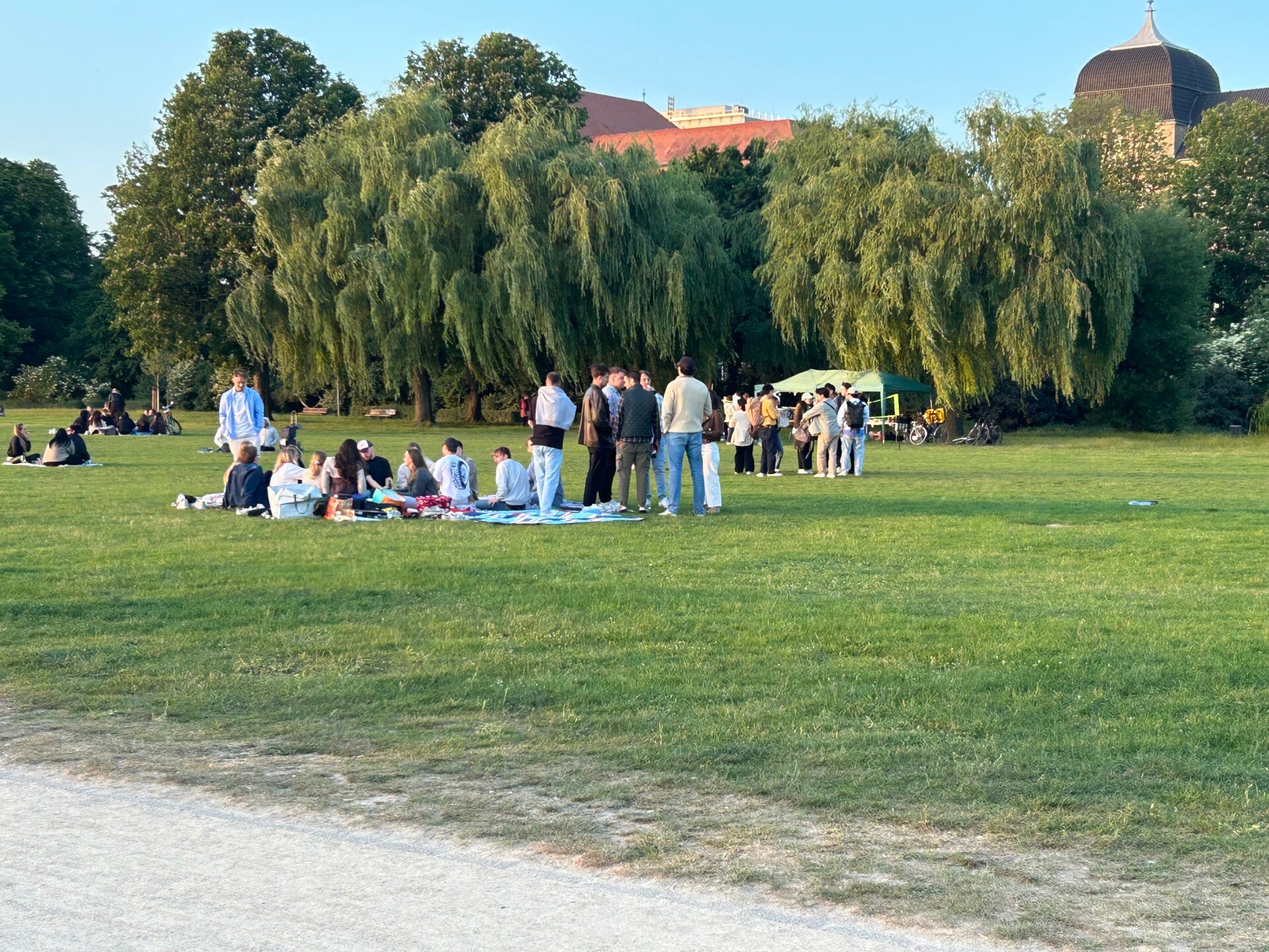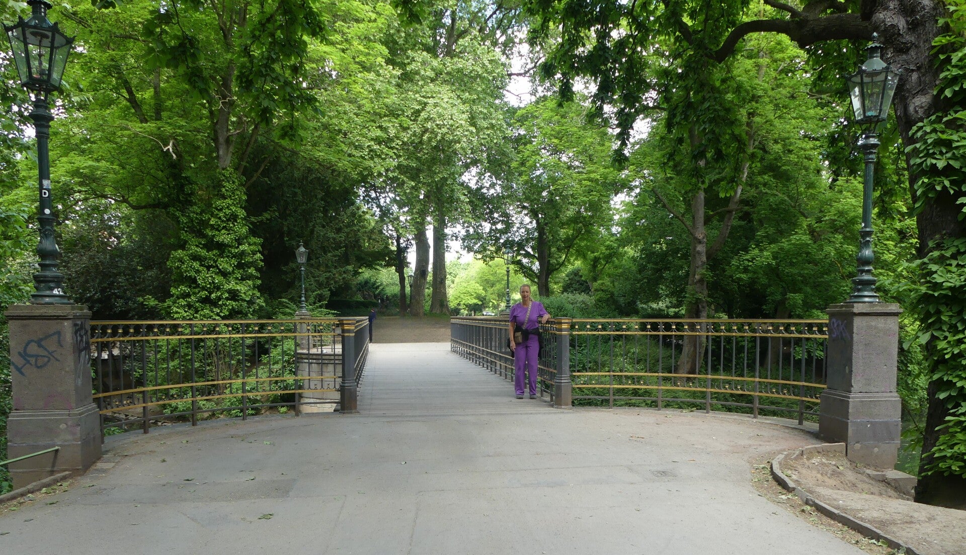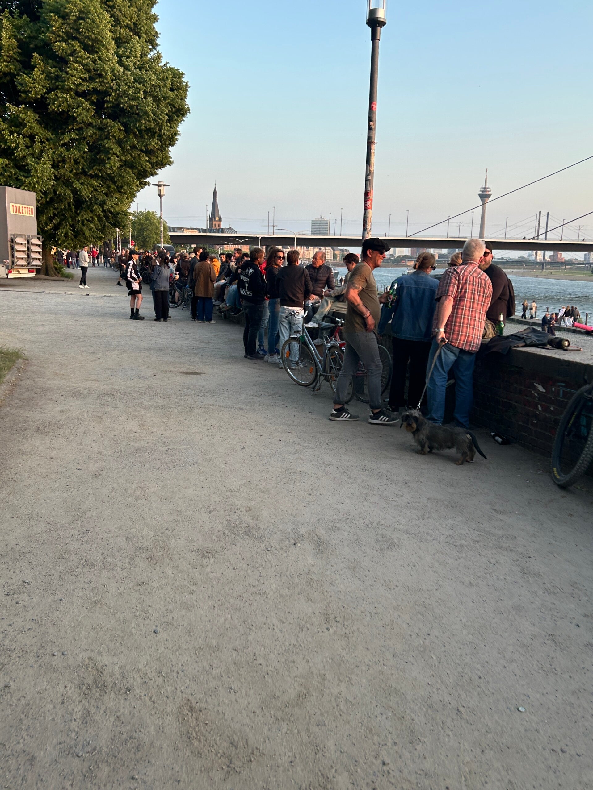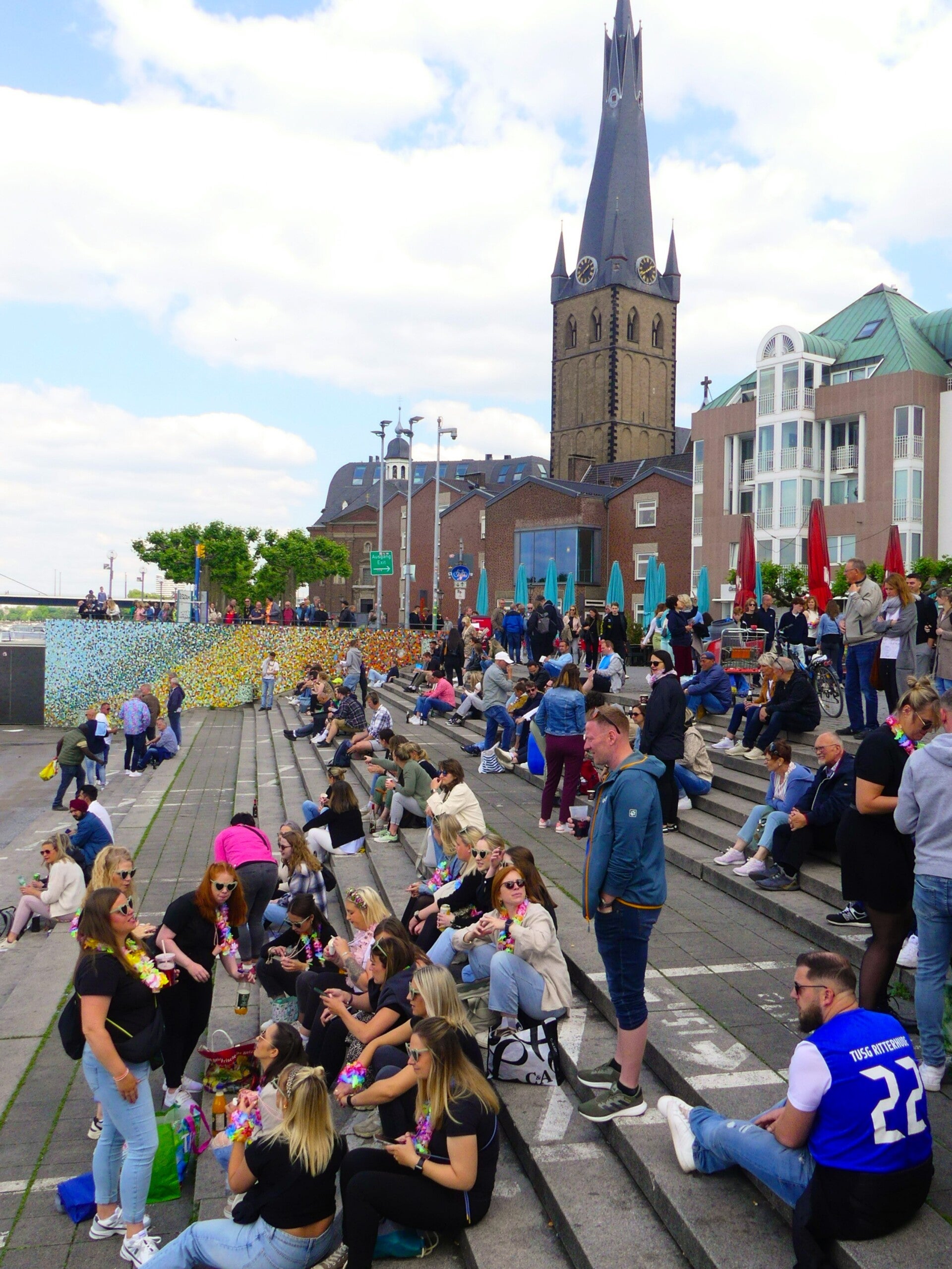 Dat het een populaire bestemming is voor de lokale bevolking merken we als we op 16 mei in de avond wandelen door het Rijnpark Golzheim. Duizenden mensen flaneren hier op de vrijdagavond, genietend van het prachtige landschap van de Nederrijn waar de zon ondergaat, jongeren spelen voetbal of volleybal. Wat ook opvalt: Allemaal hebben ze drank bij zich, of een krat bier, of een fles wijn. Maar het is gezellig.