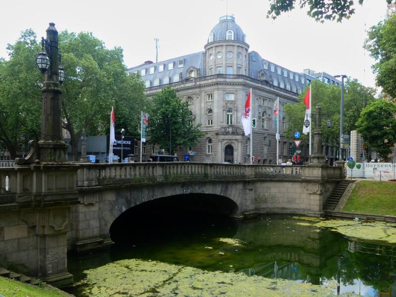 Wij starten op de Königsallee ̶ ook wel de Kö genoemd ̶ dat letterlijk betekent koningslaan. Deze luxe boulevard uit de 18e eeuw is prachtig aangelegd met een gracht in het midden en kastanjebomen langs de kant. Er zijn zowel historische gebouwen als moderne architectonische meesterwerken zoals de Kö-Bogen, een indrukwekkend gebouw van glas en staal (zie verder). Alle grote merken hebben hier een winkel. Het is er druk met bezoekers, zelfs al op de zaterdagochtend. Wat jammer is, dat auto's ook door de straat kunnen rijden. Maar wandelpaden maken dit goed.