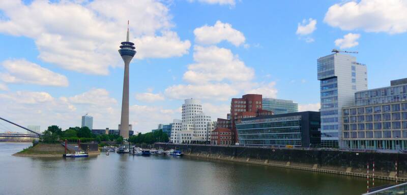 Uiteraard bezoeken wij de Rheinturm. De Rheinturm is met 240,5 meter het hoogste gebouw van de stad en de tiende hoogste zendmast van Duitsland. De toren werd in 1982 voltooid en doet dienst als zendmast voor ondere andere radio en televisie. Met de snelle lift worden wij naar 170 meter hoogte gebracht waar een uitzichtplatform is. Je hebt hier een prachtige uitzicht over Düsseldorf.