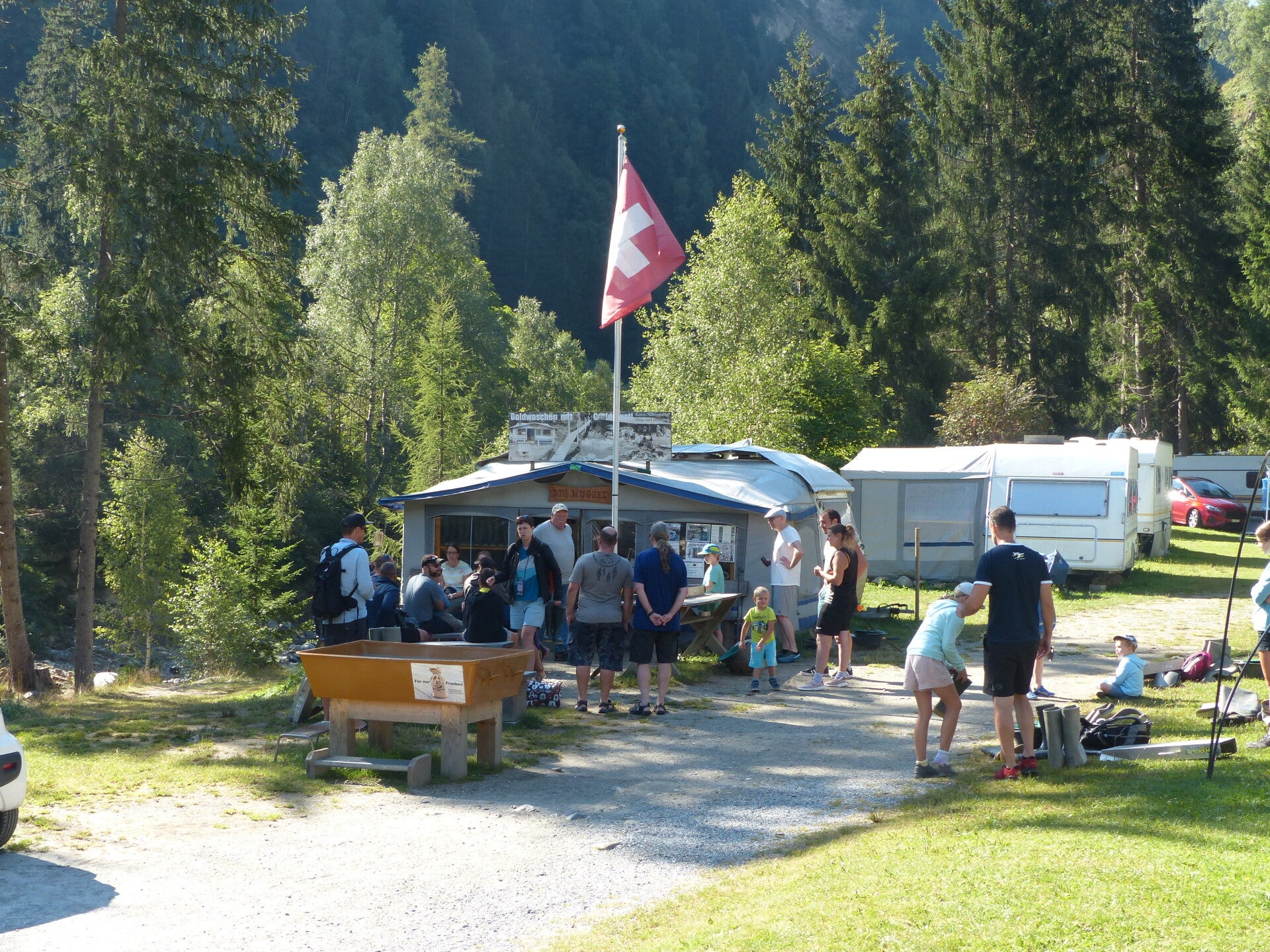Bij Fontavines treffen we Gold-Gusti aan bij zijn caravan. Mensen gaan met Gold-Gusti goud zoeken. Een intensieve cursus kost 200 CHF (is 200 Euro en nog een beetje)! Bij Fontavaris treffen we voldoende avonturiers aan die goud aan het zoeken zijn.