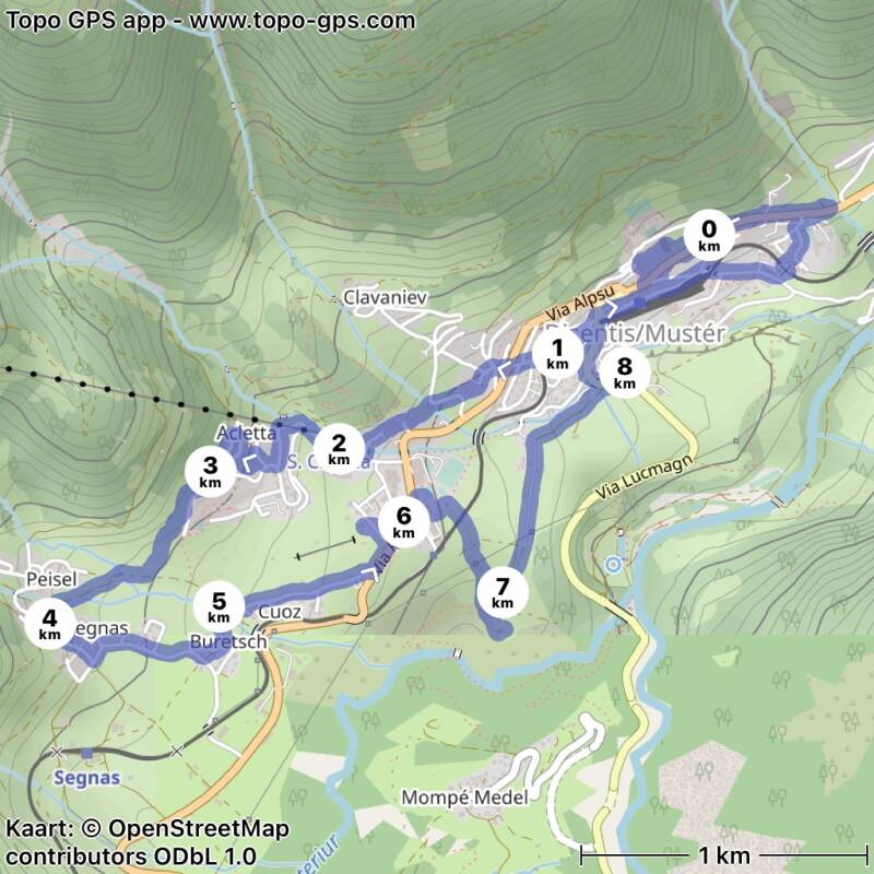 Een kapel(voet)pad <<Senda de Baselgias e capluttas da Muster>> leidt door het dal langs de vele witte kapellen en het klooster in Disentis. Wij wandelen een deel van dit kapel(voet)pad in de omgeving van Disentis.