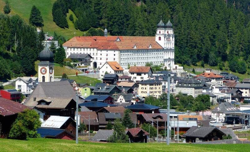 Aan het einde van het dal van de Vorderrhein staat het witte klooster te schitteren in Disentis.