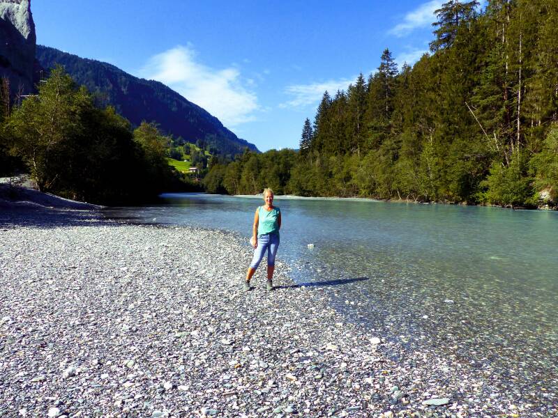 We starten vanaf het treinstation bij Valendas. We lopen langs het spoor. Zou in Nederland niet meer kunnen. Blijkbaar hebben de mensen hier meer verantwoordelijkheidsgevoel en kijken ze beter uit! Terwijl we wandelen horen wij het water, maar de hoge bomen maken het onmogelijk om een blik te werpen op het water. Gelukkig kunnen we al snel dicht bij de Rijn komen. Waar we gisteren boven op kloof liepen, lopen we nu door en langs de Rijn met fascineren rotswanden en rotsformaties. Ook hebben we prachtig zicht op de omliggende bergen.