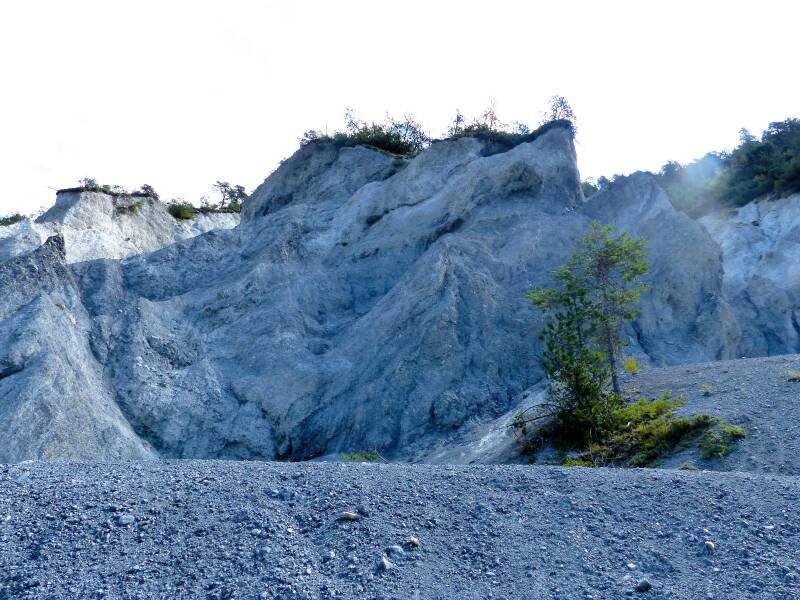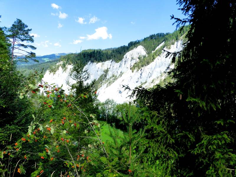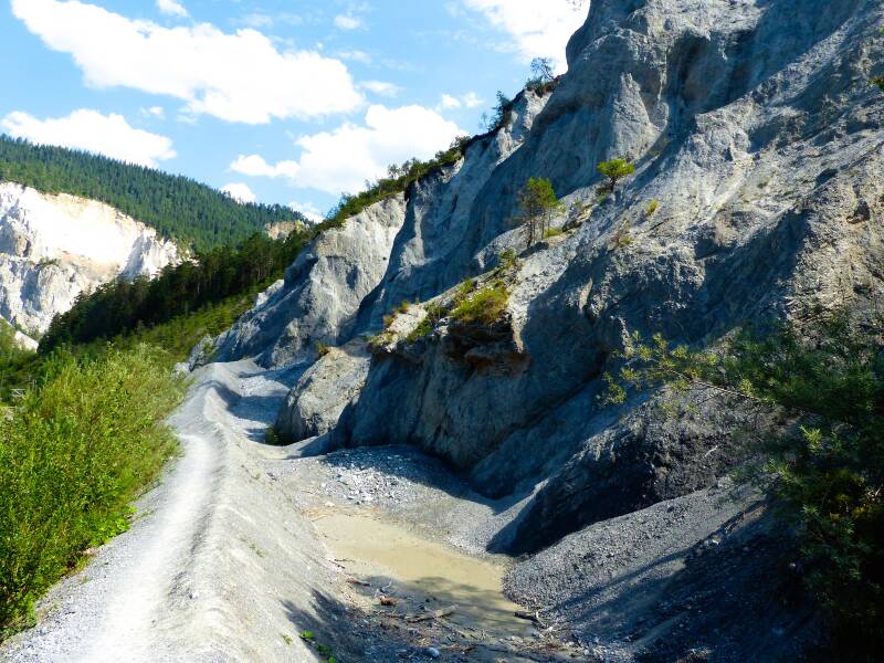 Het pad loopt afwisselend door de bossen en open plekken. Het zicht blijft overal geweldig. Soms gaat het pad omhoog, soms omlaag. Maar als we richting Versam lopen, dan wandelen we steeds hoger en steeds minder langs het water. We kunnen niet meer bij de Rijn komen. Maar.......De rotswanden en rotsformaties worden witter en witter. Ook indrukwekkender. De paden worden smaller. We zien mensen in kajaks de rivier afdalen.