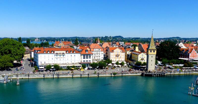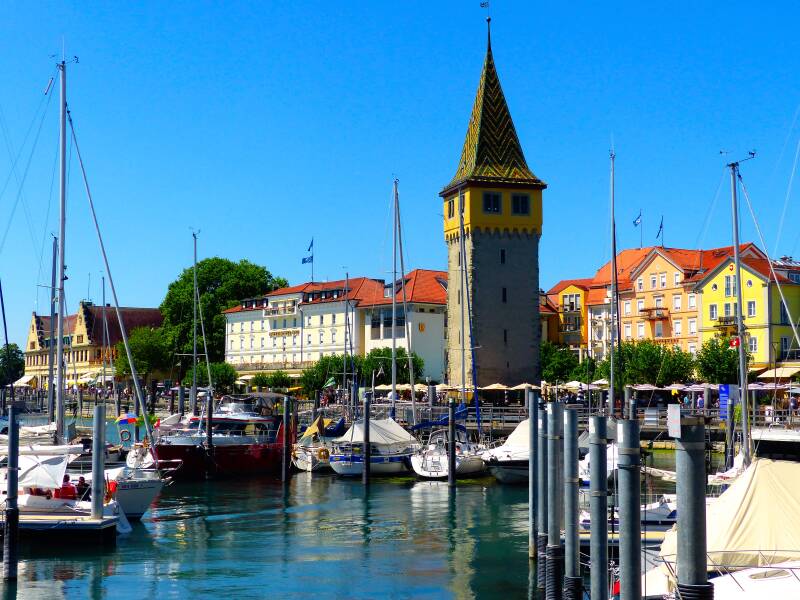 Aan het einde van ons bezoek aan het eilandnog even flaneren over de oeverpromenade. Veel terrassen en de Mangturm. Deze toren was ervoor de bescherming en het verzet van de zeehaven van Lindau. De toren, die 20 meter hoog was en voorzien was van schietgaten, was vroeger omringd door water en een perfecte uitkijkpost aan het einde van de stadsmuur. Pas toen de nieuwe vuurtoren van Lindau in 1856 voltooid was, verloor de Mang-toren zijn functie als sein- en observatiepost. Het werd één verdieping verhoogd en bedekt met de kenmerkende, geglazuurde tegels die het tegenwoordig een populair fotomotief maken omdat het voor velen sprookjesachtig is.