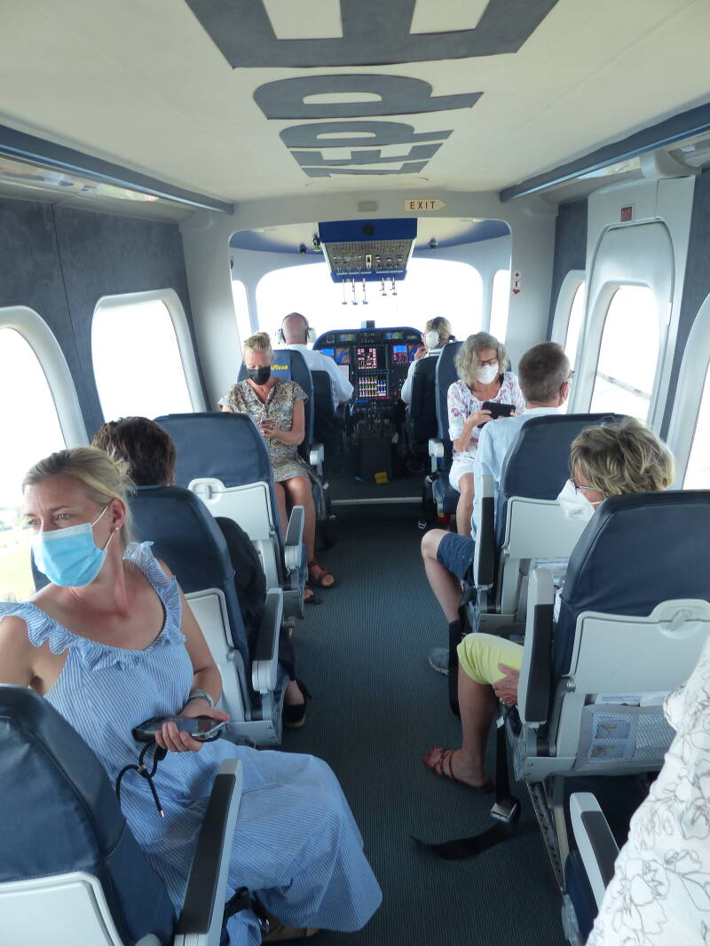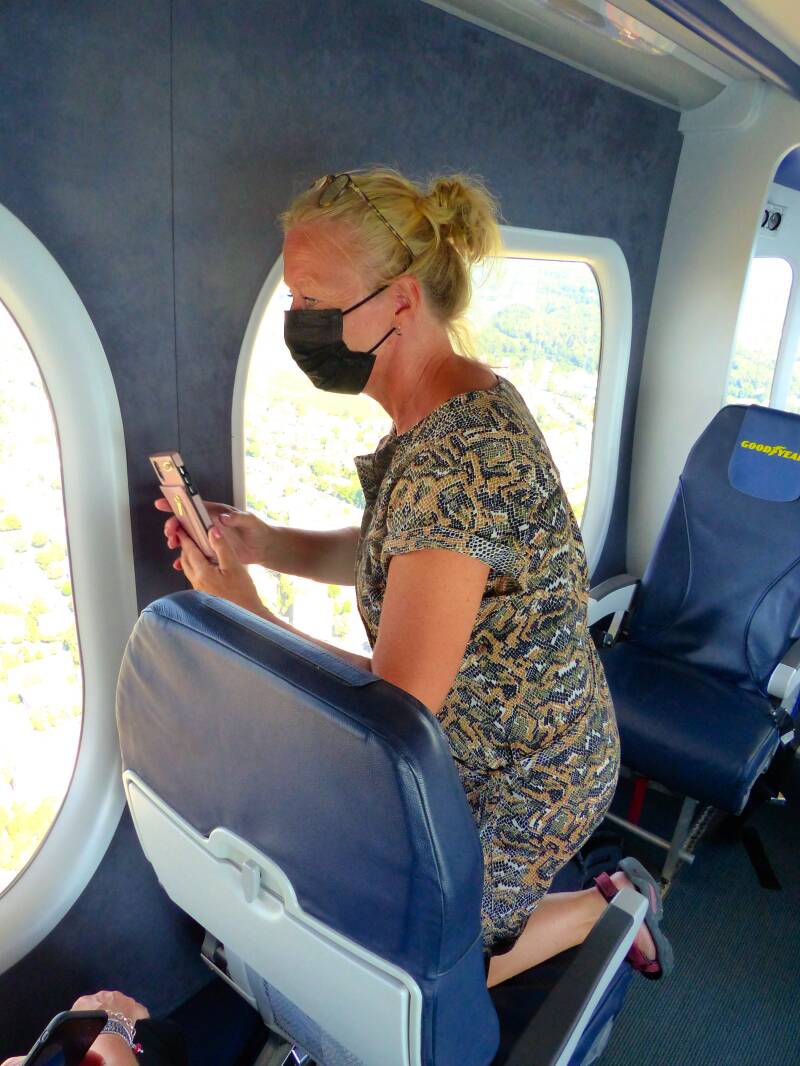 Nadat we zijn ingestapt volgens het riuteel, twee mensen eruit, twee mensen erin, etc., etc horen wij de motoren zachtjes zoemen, op majestueuze wijze stijgt de Zeppelin NT snel naar ca. 300 meter hoogte waarop hij blijft zweven. De gordels los mogen los, we kunnen rondlopen in de Zeppelin en een blik werp over de schouder van de piloot is mogelijk.