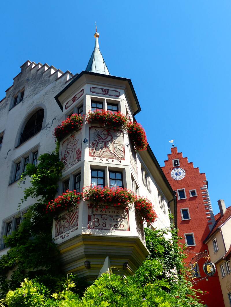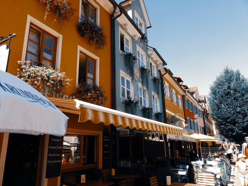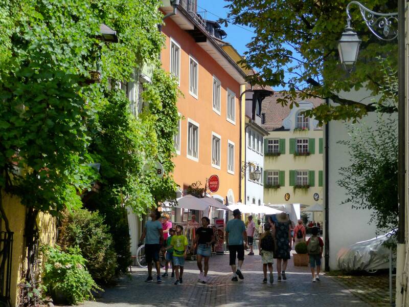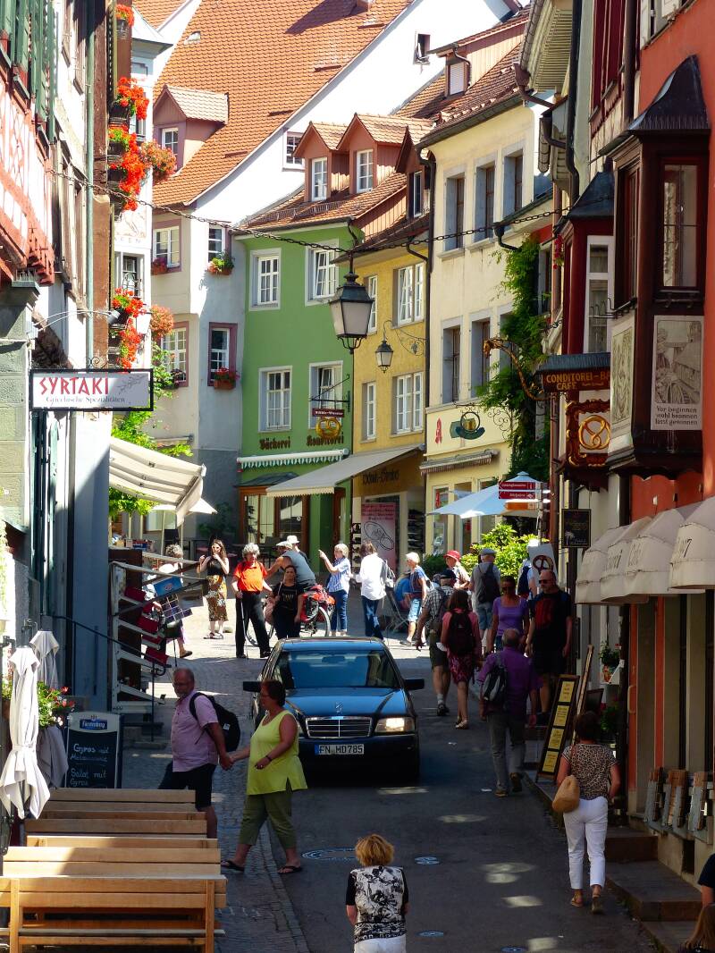 De misschien wel tweehonderd meter lange oeverpromenade is de toeristische aanblik van Meersburg. Daarachter passen nog net twee rijen huizen; de rest van het stadje ligt op de berg erachter. Huizen met daken van leitjes in rode en gele kleurschakeringen, met twee verdiepingen, vakwerk en trapgevels.