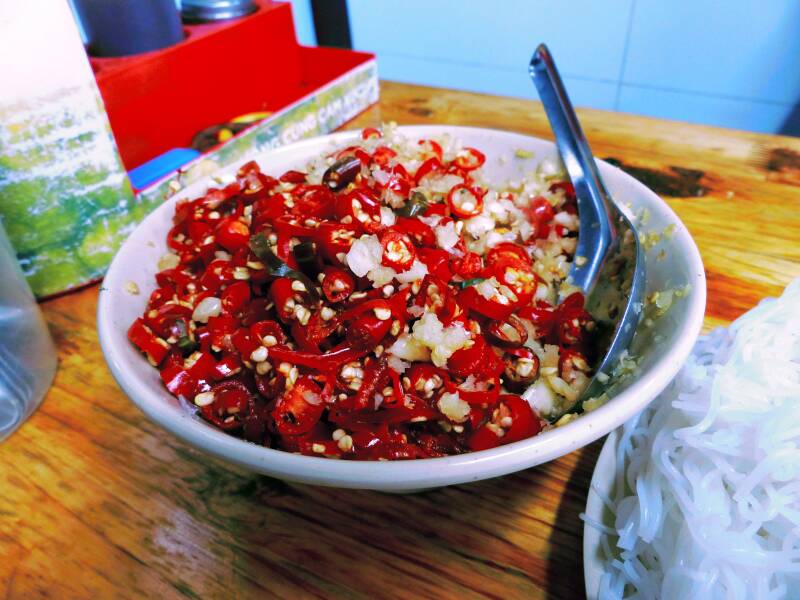 De laatste dish die we eten, we zitten eigenlijk al propvol is Bánh cuốn. Bánh cuốn is gemaakt van een dun rijstvel gevuld met een mengsel van gekookt gekruid gemalen varkensvlees, gehakte paddestoel en afgemaakt met knapperige gefrituurde sjalotten. Bijgerechten voor dit gerecht bestaat uit chả lụa (Vietnamese varkensworst),