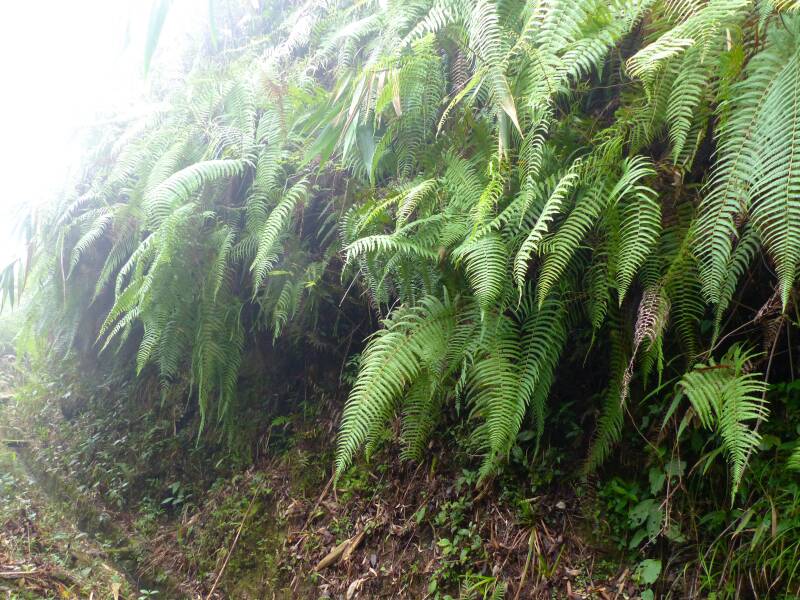 Dan wandelen we door. We komen langs prachtige natuur. Enorme grote varens. We lopen langs water. We komen Buffelo's tegen. Het is werkelijk heerlijk wandelen. De zon komt er een beetje door.