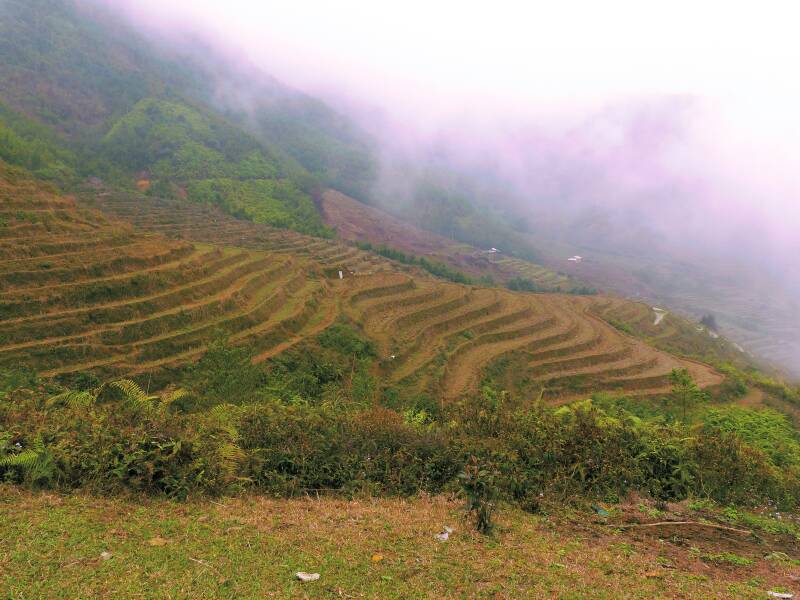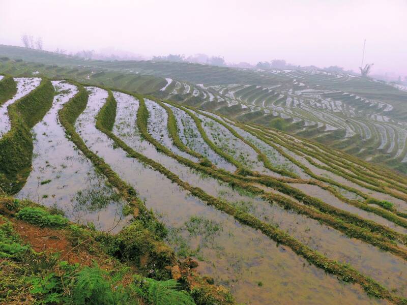 We starten vanaf onze Bungelow. Nog geen paar honderd meter gewandeld te hebben, zien we de eerste rijstvelden al liggen. Het is echter erg mistig. Blijkbaar is dat gewoon in deze tijd. Ook is het geen oogstseizoen waardoor we de rijstvelden niet in de prachtige goudgele kleuren zullen zien zijn. Jammer. Maar toch wordt Maart gezien als een goede tijd om naar Sa Pa te trekken. In de zomervakantie is er vooral regenachtig weer.
