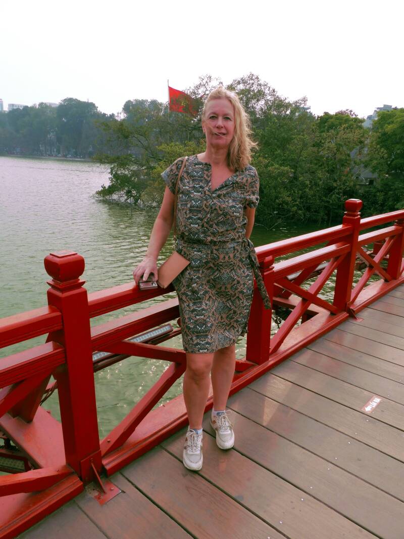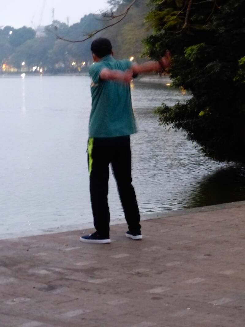 Rond het Hoan Kiem-meer in de hele vroege ochtend nog voor zonsopgang zie je locals sporten , en zelfs Tai Chi en line-dansen. Onze tour guide neemt ons 's morgens mee Hanoi in. We lopen rond half 6 (!) langs het Koan Kiem-meer. Waanzinnig gezicht. Muziek erbij, en gaan met die banaan.