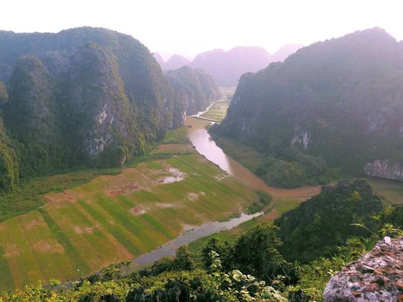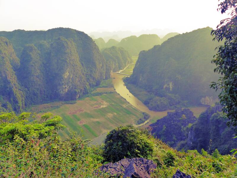 Vervolgens gaan we naar Mua Cave. Zoals de naam al doet vermoeden is er een grot te vinden, maar het hoogtepunt van de Mua Cave is het panoramische uitzicht vanaf de top. Bij het uitkijkpunt kun je genieten van een prachtig uitzicht over de Tam Coc rivier, met bergen om je heen en de rijstvelden beneden. Daar waar wij gevaren hebben. Het is een korte wandeling, maar wel één met 500 treden. Dat was geen makkie.