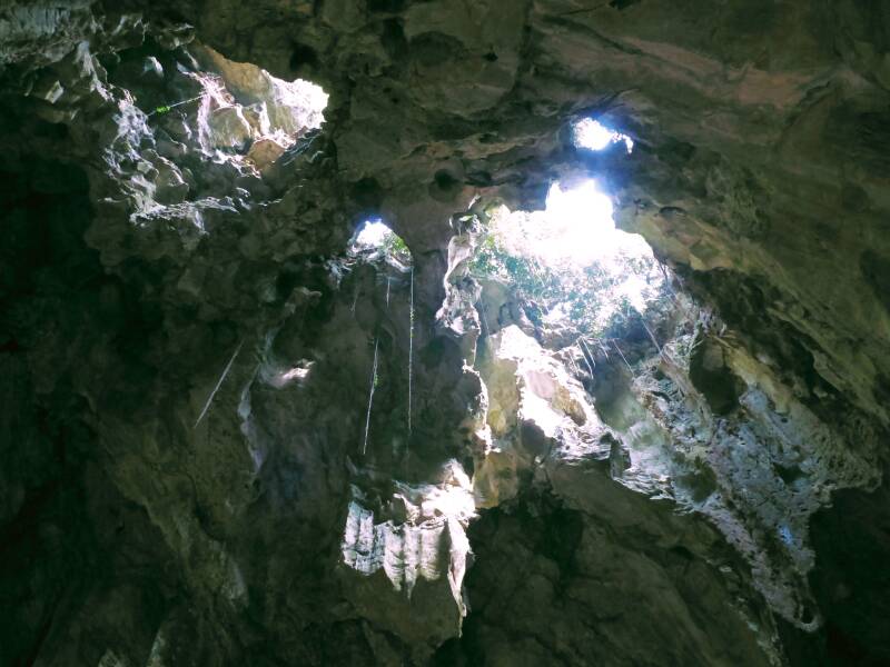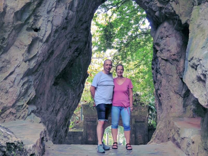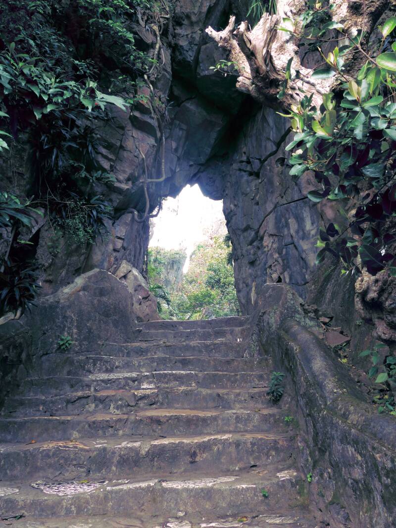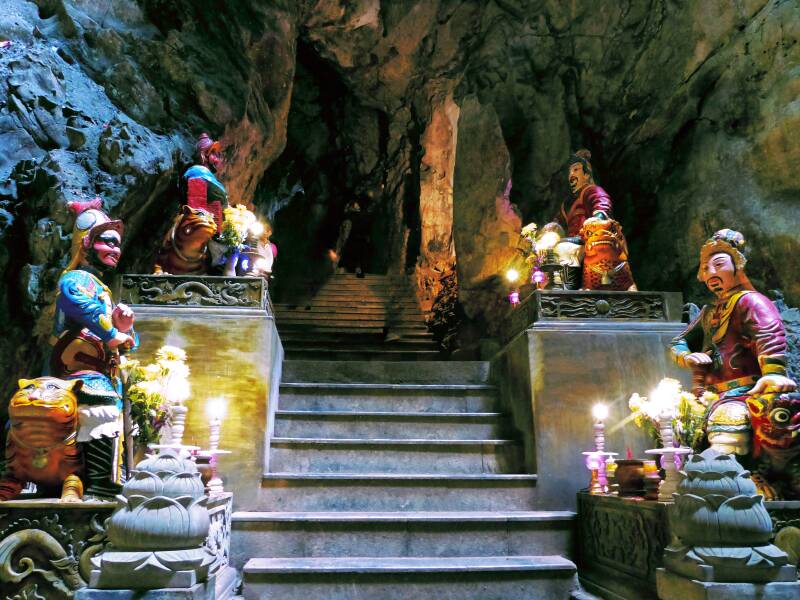 Huyen Khong is de grootste van de grotten en een must voor een bezoek. Eerst nog wat klimmen, de poort door en dan komen we aan bij deze grot. Door het ingestorte plafond kunnen lichtstralen de donkere grot doorboren, waardoor binnenin bijzondere schijnwerpers ontstaan. Huyen Khong werd ooit gebruikt als geheime basis en later als veldhospitaal voor Vietnamese soldaten tijdens de Vietnam oorlog. De ingang is overweldigend. In de grot staan een grote stenen Boeddha