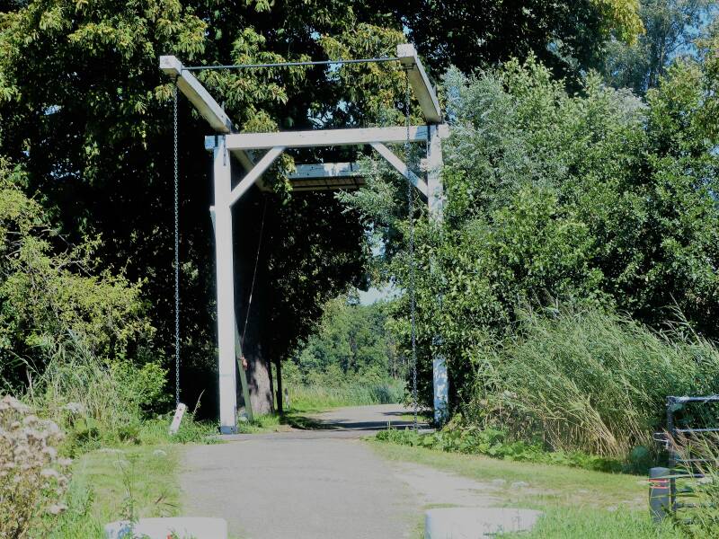 Na de lunch wandelen we verder. Het tweede deel van de etappe. Eerst een stukje langs de vecht met hele mooie woonboten. Dan langs het Torenfort Ossenmarkt. Dit fort maakte onderdeel uit van de Hollandse Waterlinie. Zie ook etappe 03. We wandelen een 4 KM's door de polder met inmiddels een brandende zon op ons hoofd. In de verte de witte spoorbrug: De Zandhazenbrug. Deze spoorbrug hebben we meerdere malen gepasseerd op weg naar weer een etappe van het Trekvogelpad.