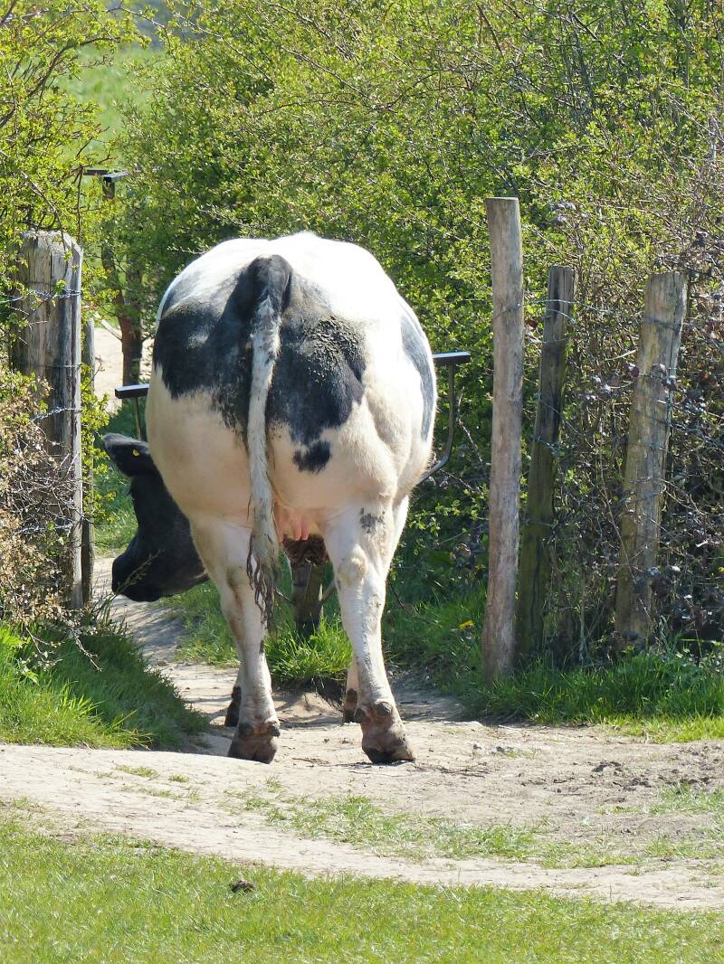 Onderweg nog even oponthoud. Een koe staat voor de ingang van een wandelpad.