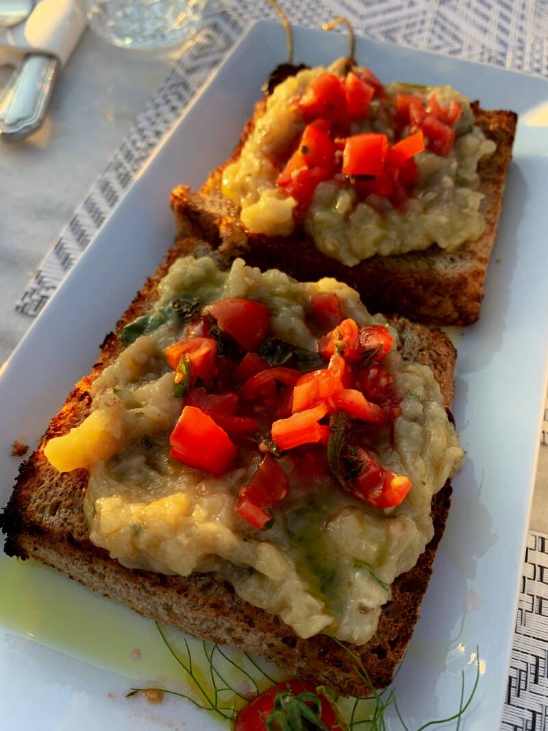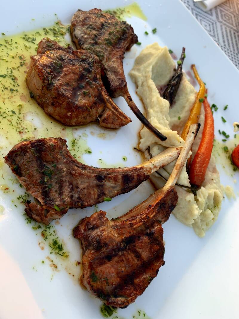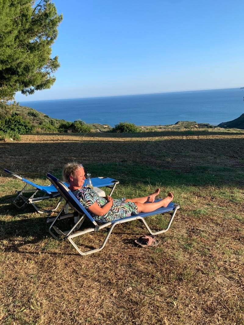 De Grieken houden van eten. Overal zijn er kleine restaurantjes. Zo is er ook een restaurant aan de voet van de Skopos: Kanalos. Kleinschalig, vriendelijk en allemaal locale producten. En goedkoop. Een liter wijn kost hier nog maar 8 Euro. Na het eten, drinken we het restant van de wijn buiten op als we plaats nemen van de ligbedden, met wederom een prachtig uitzicht.