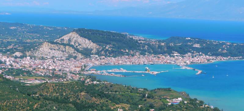 Aan de andere kant van het eiland zien we Zakynthos stad opdoemen