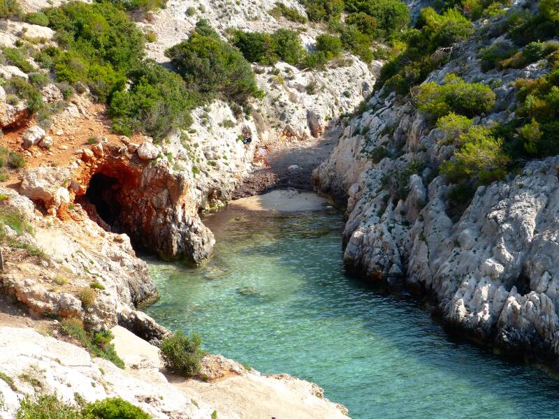 Het eerste bezoek brengen we aan het beroemde strand Porto Zorro (westelijk deel) / Porto Azzuro (oostelijk deel) met uitzicht op de heuvel Skopos. De rotsen in zee zijn een trekpleister van het Porto Zoro. Rondom de rotsen zie je veel vissen en de nodige begroeiing onderwater. Het zeewater is hier helder en ondiep.