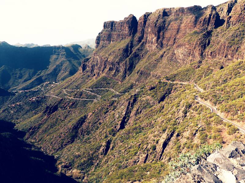 De weg naar Chamorga is al één en al pracht. Wat een natuur. De T12 en later de T123 leiden je langs kleine smalle wegen, met veel bochten door een berggebied. Berg op, mooie vergezichten.